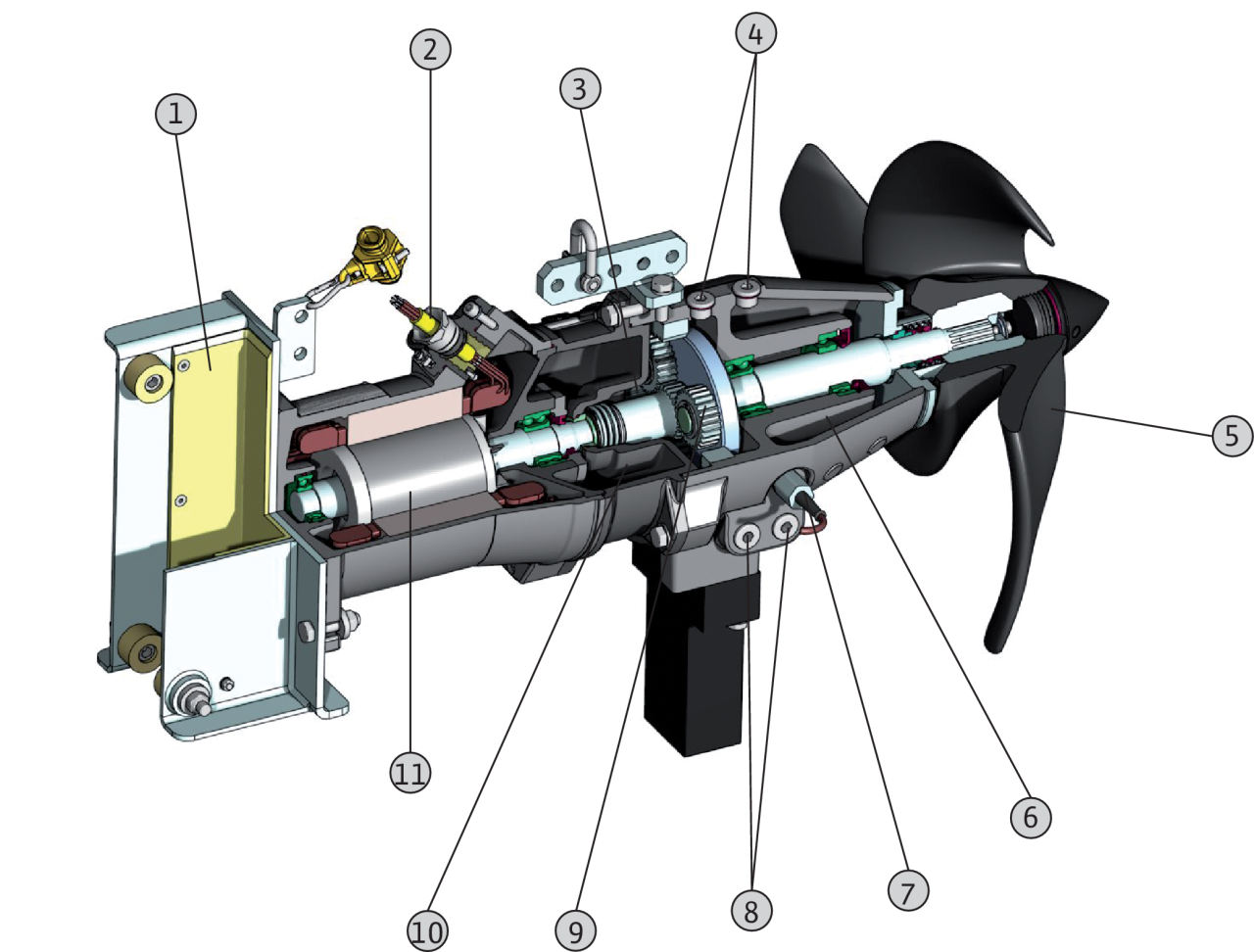 1 = рама, 2 = кабель, 3 = камера привода, 4 = маслоналивные пробки, 5 = пропеллер, 6 = форкамера, 7 = устройство контроля герметичности камеры уплотнений (в качестве опции), 8 = винты слива масла, 9 = планетарный редуктор, 10 = камера уплотнений, 11 = электродвигатель