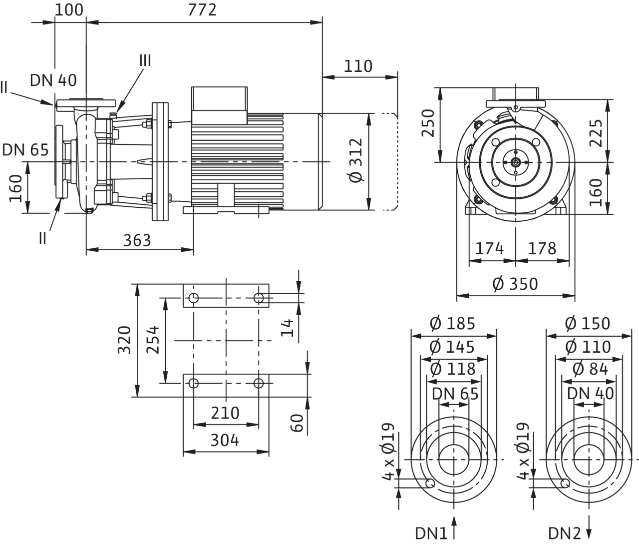 Одноступенчатый центробежный насос с сухим ротором блочного типа для установки на фундаменте. Блочное исполнение с низким уровнем шума и вибрации с промежуточным корпусом и неподвижно присоединенным унифицированным (стандартным) электродвигателем. С не зависящим от направления вращения сильфонным скользящим торцевым уплотнением (от 37 кВт/4-контактного и 45 кВт/2-контактного с картриджным торцевым уплотнением в системе Back-Pull-Out для замены скользящего торцевого уплотнения без демонтажа электродвигателя) и снижающим кавитацию рабочим колесом. Фланцы имеют штуцеры R 1/8 для измерения давления. На корпус насоса и промежуточный корпус нанесено катафорезное покрытие. Серийные электродвигатели с технологией IE3.