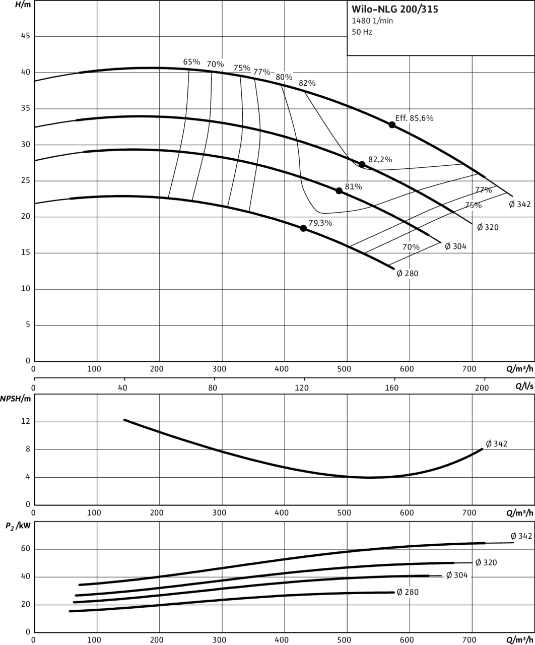 Электродвигатель IEC с 3 термодатчиками. Уплотнение вала посредством скользящего торцового уплотнения до температуры 120 В°C. Корпус из чугуна с шаровидным графитом, вал из нержавеющей стали, рабочее колесо из серого чугуна (рабочее колесо из бронзы доступно за дополнительную плату). Электродвигатели с технологией IE3.