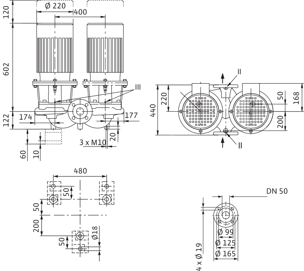 Линейный сдвоенный насос с двумя одноступенчатыми центробежными насосами с сухим ротором в общем корпусе с перекидным клапаном для установки в трубах или на фундаменте. Фланцевая заглушка корпуса и консоли предоставляются за отдельную плату. Блочное исполнение с низким уровнем шума и вибрации с промежуточным корпусом и неподвижно присоединенным унифицированным (стандартным) электродвигателем с фланцевым креплением. С не зависящим от направления вращения скользящим торцовым уплотнением в кожухе с принудительным охлаждением и снижающим кавитацию рабочим колесом. Фланцы имеют отверстия R 1/8 для измерения давления. На корпус насоса и промежуточный корпус нанесено катафорезное покрытие.