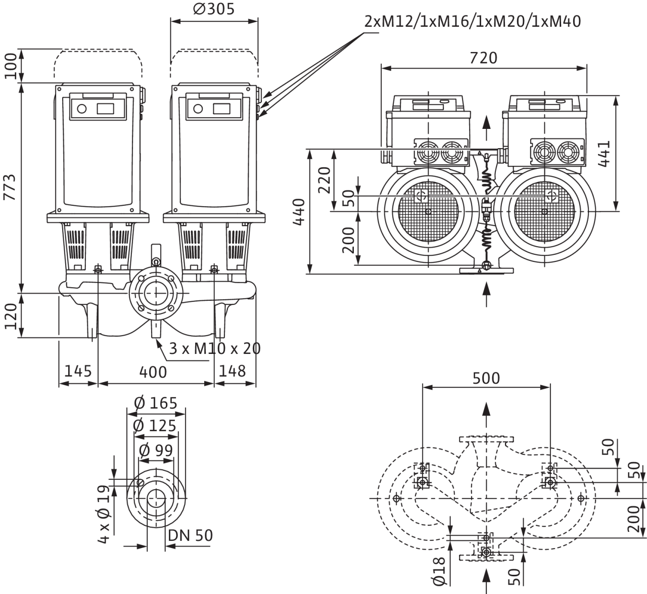 Сдвоенный насос с сухим ротором линейного типа для установки в трубах или на фундаменте со встроенным частотным преобразователем для электронного регулирования параметров, в том числе постоянного или переменного перепада давления (Δp-c/Δp-v).