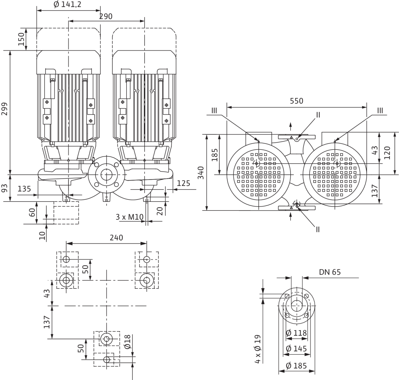 Корпус с опорными ножками для монтажа на фундаменте, консоли по запросу; II отверстие для измерения давления R1/8; III удаление воздуха R1/8