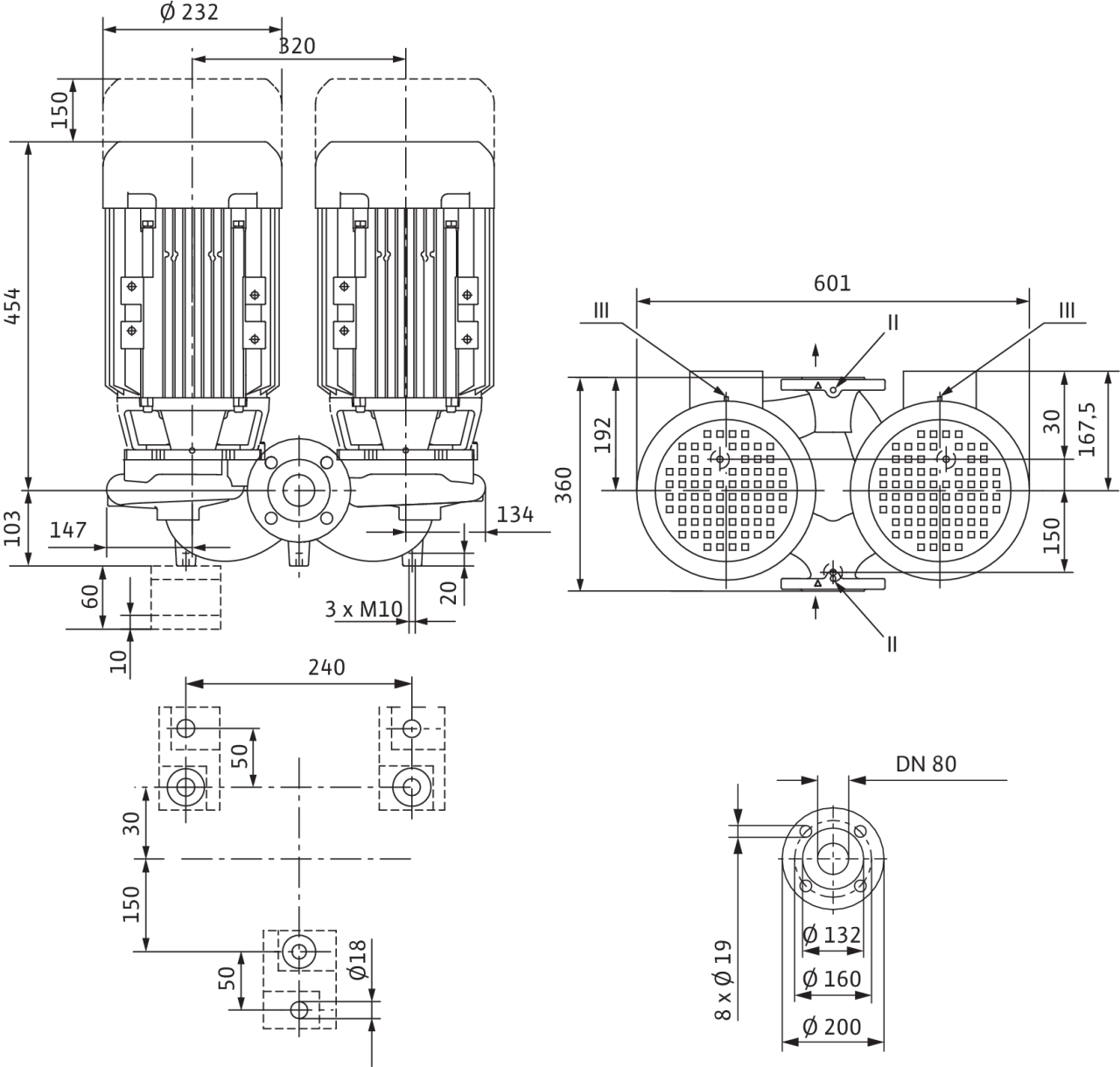 Корпус с опорными ножками для монтажа на фундаменте, консоли по запросу; II отверстие для измерения давления R1/8; III удаление воздуха R1/8