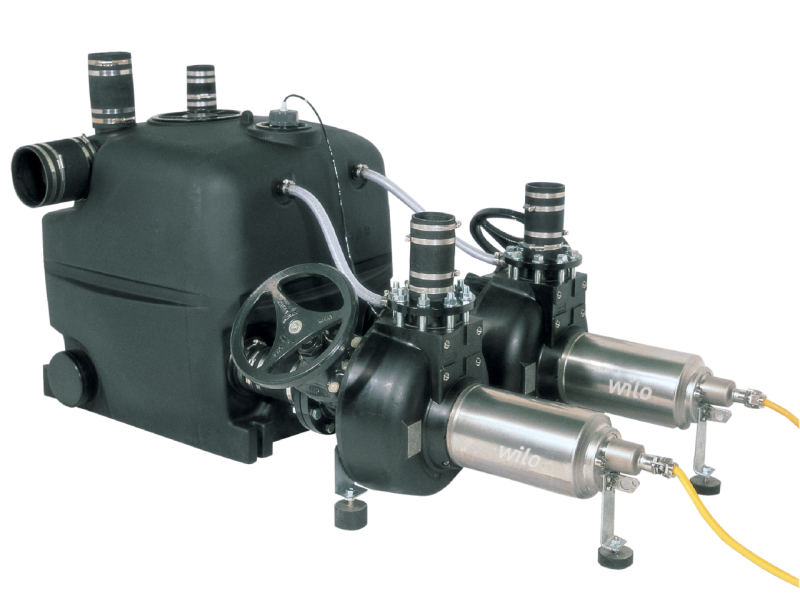 Готовая к подсоединению, полностью затапливаемая автоматическая напорная установка для отвода сточных вод в виде двухнасосной установки с автоматическим переходом с резервного режима на режим пиковой нагрузки. Два отдельно предвключенных непогруженных погружных насоса для отвода сточных вод в трехфазном исполнении с охлаждающим кожухом, корпусом из нержавеющей стали и датчиком контроля температуры обмотки электродвигателя. Два газо- и водонепроницаемых сборных резервуара из пластмассы с четко определенными подключениями к подводящему трубопроводу и системой регулирования уровня при помощи датчика уровня. Прибор управления с микропроцессорным управлением с