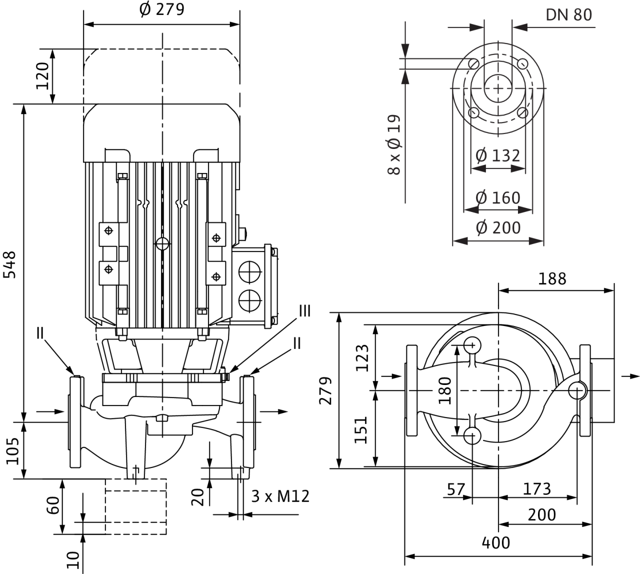 Корпус с опорными ножками для монтажа на фундаменте, консоли по запросу; II отверстие для измерения давления R1/8; III удаление воздуха R1/8