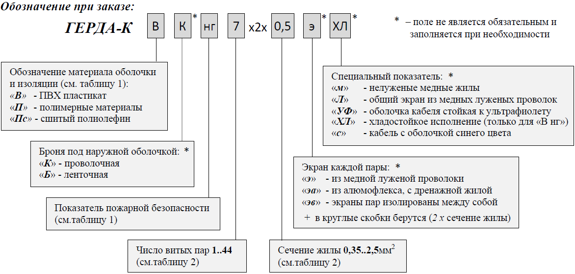 Пример обозначения при заказе: «Кабель ГЕРДА-КВКнг 7х (2х0,5)э ХЛ ТУ3581-019-76960731-2010» – кабель монтажный парной скрутки с медными лужеными жилами, с 7-ью экранированными парами жил номиналь- ным сечением 0,5м м² , изоляция жил из ПВХ, оболочка из поливинилхлоридной композиции пониженной горючести, экран пар из медной луженой проволоки, под наружной оболочкой броня из стальных оцинкованных проволок, кабель хладостойкого исполнения, температура эксплуатации от –60° до +70°С.