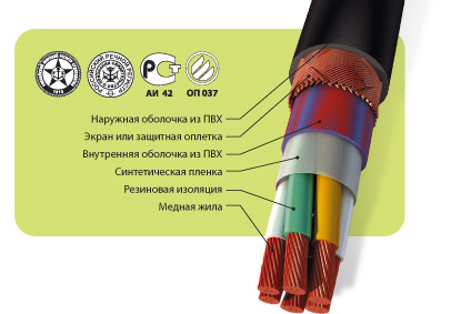 Токопроводящие жилы судовых кабелей скручивают из медной мягкой проволоки, на токопроводящую жилу накладывают резиновую изоляцию. Изолированные жилы многожильных кабелей скручивают концентрическими повивами в разные стороны. В каждом повиве имеется счетная пара, расцветка жил которой отличается друг от друга и от остальных жил. Поверх скрученных жил накладывается синтетическая пленка, внутренняя и наружная оболочки из ПВХ пластиката.