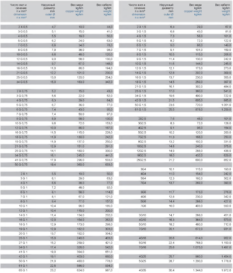 | Артикул | Название | Информация | Диаметр | Размеры | Вес меди | Вес кабеля |