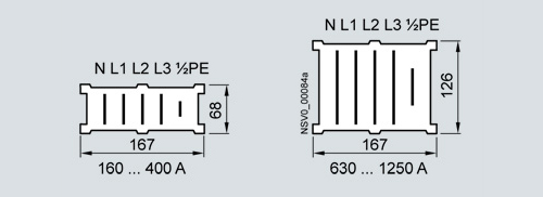 - Абсолютно надежное соединение всех 5 шин одновременно обеспечивается равномерным прижимным усилием. Быстрый монтаж до 400 A благодаря втычным зажимам, от 500 A до 1250 A — благодаря штифтовым зажимам.• Встроенный компенсатор расширения шин при нагреве.