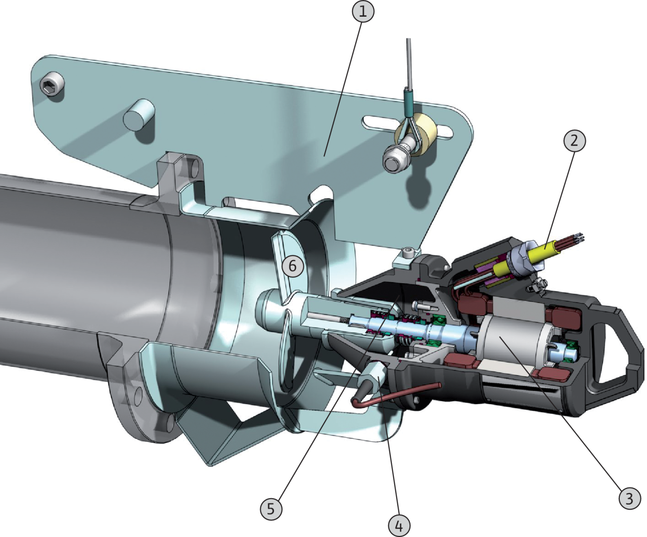 1 = гидродинамический корпус, 2 = кабель, 3 = электродвигатель, 4 = устройство контроля герметичности камеры уплотнений (по заказу), 5 = камера уплотнений, 6 = пропеллер
