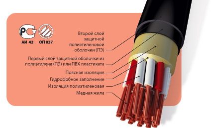Кабель сигнально-блокировочный с медными жилами, с изоляцией из ПЭ, в оболочке из ПЭ, с броней из двух стальных лент, в шланге из ПВХ пластиката |