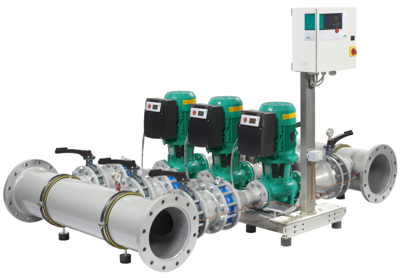 Высокоэффективная, предварительно смонтированная многонасосная установка для применения в системах отопления и кондиционирования, состоящая из опорной плиты с амортизаторами колебаний, фланцевыми распорками, 2 покрытыми лакокрасочным покрытием стальными распределителями с манометрами со стороны всасывания и нагнетания, энным количеством электронно регулируемых линейных насосов (включая 1 резервный насос), прибором управления SCe-HLKK с соединением, обратными клапанами со стороны конечного давления, ручными запорными клапанами, контрфланцами с уплотнением со стороны давления наддува и со стороны конечного давления, конусами и датчиком перепада давления с соединительными трубопроводами.