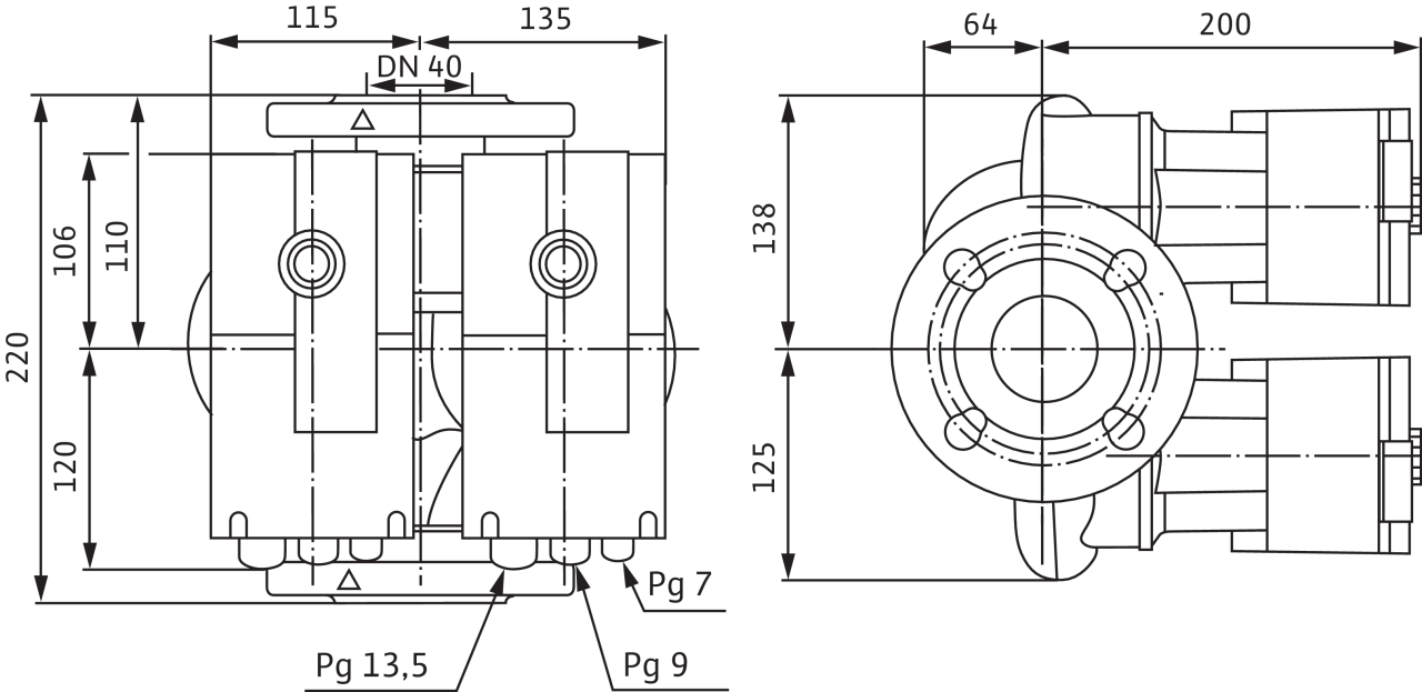 Сдвоенный насос с мокрым ротором с низкими эксплуатационными затратами для установки в трубах. Возможно применение во всех областях отопления, вентиляции и кондиционирования (от -10 В°C до +110 В°C). Со встроенным электронным регулированием мощности для поддержания постоянного/переменного перепада давления. Серийное исполнение с однокнопочной панелью ручного управления для каждого насоса для следующих операций: