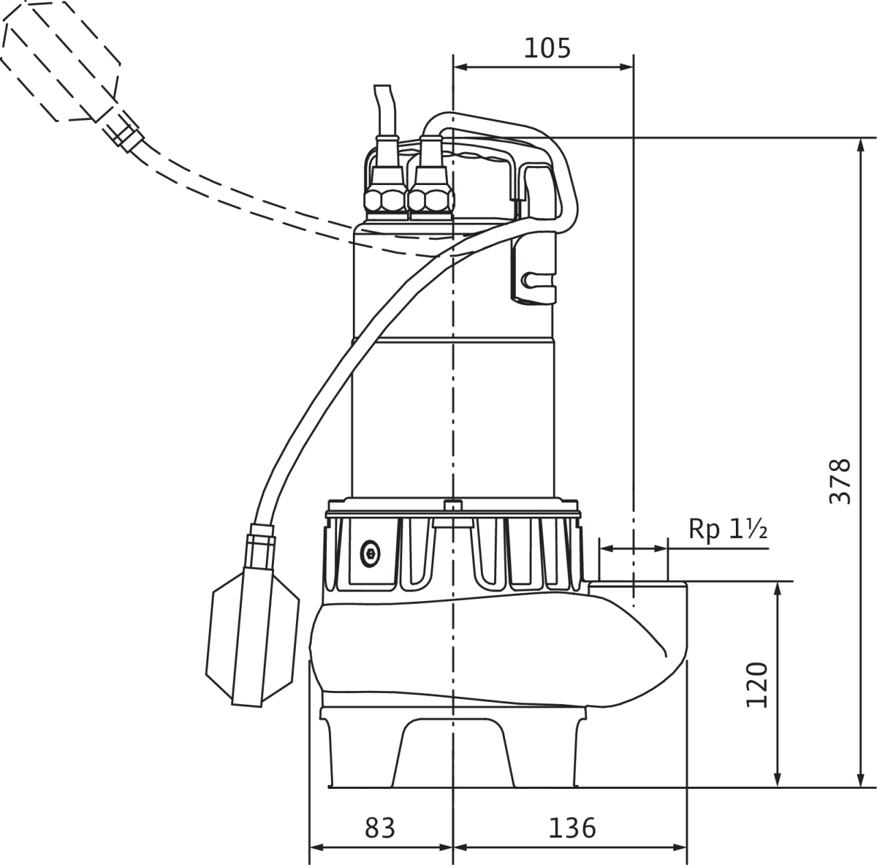 Погружной блочный агрегат для вертикальной установки в погруженном состоянии для перекачивания загрязненной воды с большим и надежным свободным проходом 35 мм. Насос в исполнении для однофазного тока в комплекте с поплавковым выключателем и соединительным кабелем длиной 5 м со штекером.
