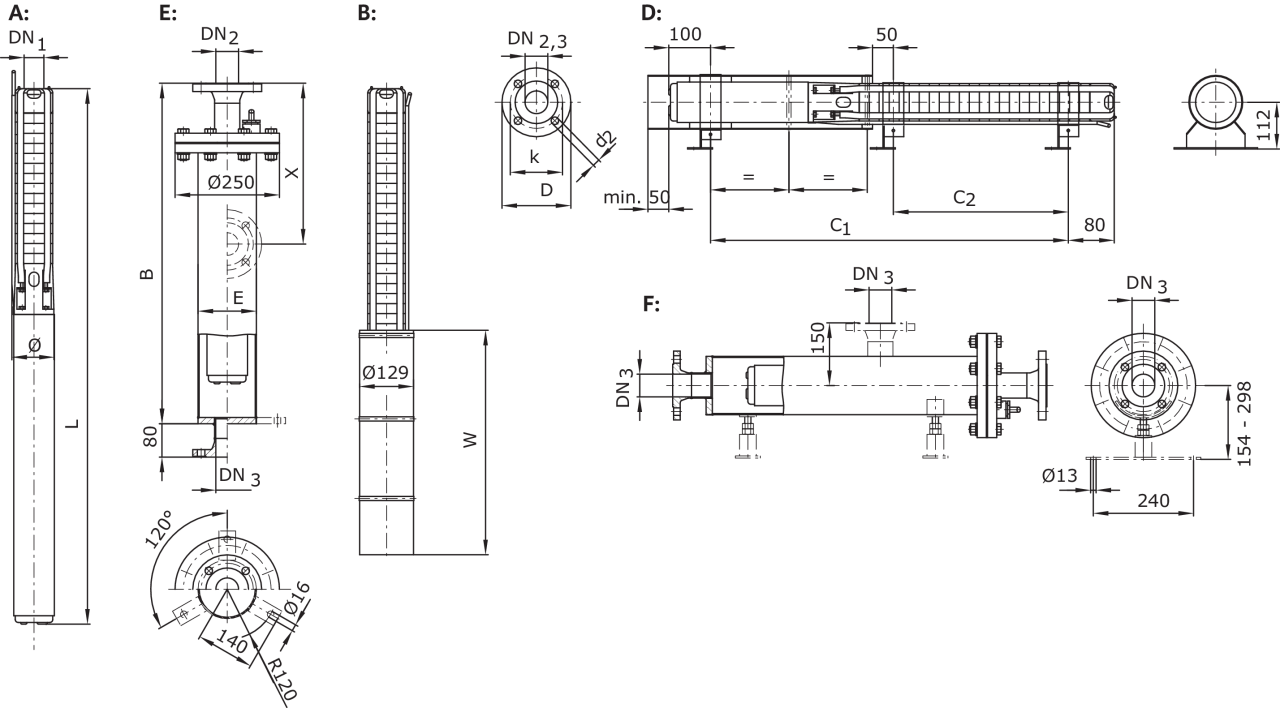 A = вертикально, B = вертикально с охлаждающим кожухом, D = горизонтально с охлаждающим кожухом, E = вертикально с напорным кожухом, F = горизонтально с напорным кожухом